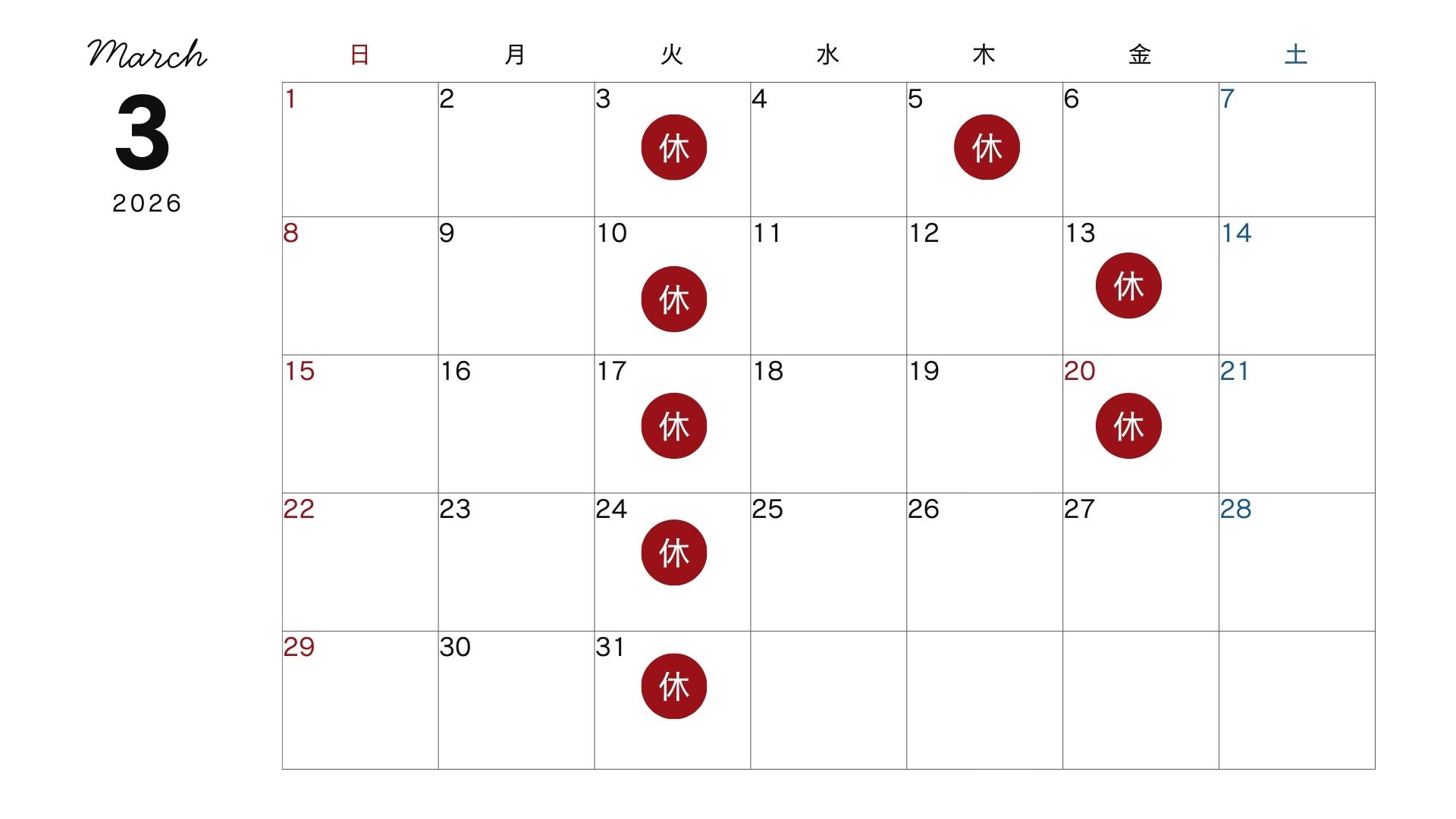 3月の営業日のご案内です。